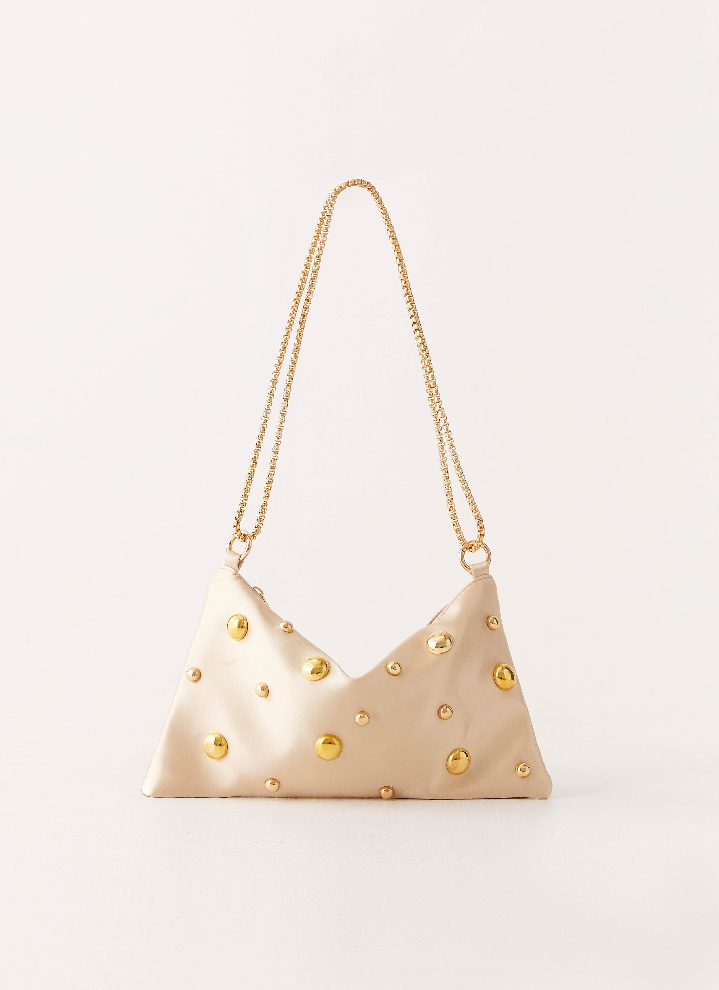 The Alira Shoulder Bag is your sleek, elegant companion for nights that sparkle. Crafted from simulated silk satin, its compact silhouette holds your essentials with style and grace—perfectly sized for evening outings.