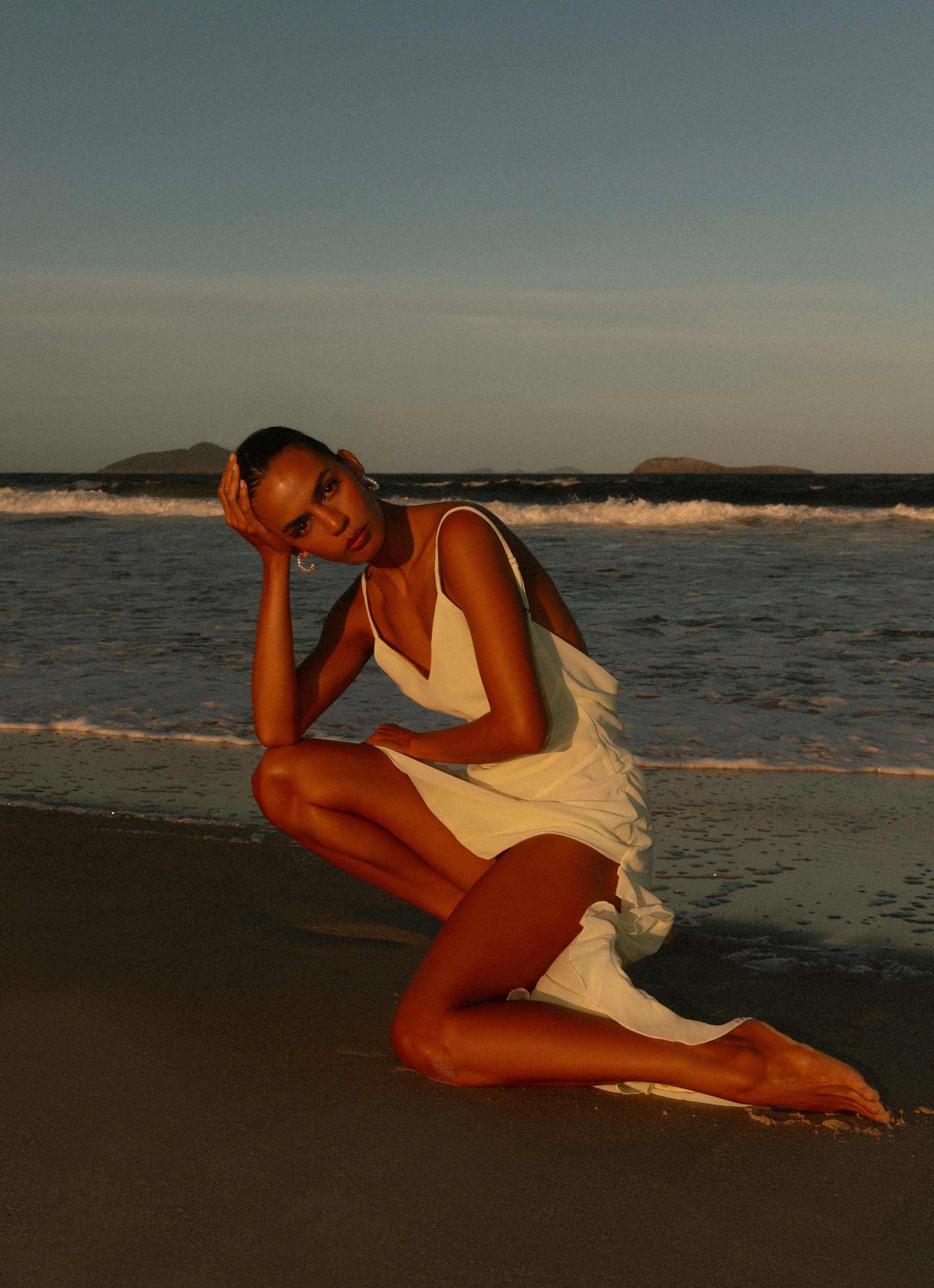Ariel maxi dress. With a plunging V-neckline and delicate, adjustable thin straps, this unlined design drapes effortlessly over the body, exuding a sense of weightless elegance perfect for any moonlit escape.