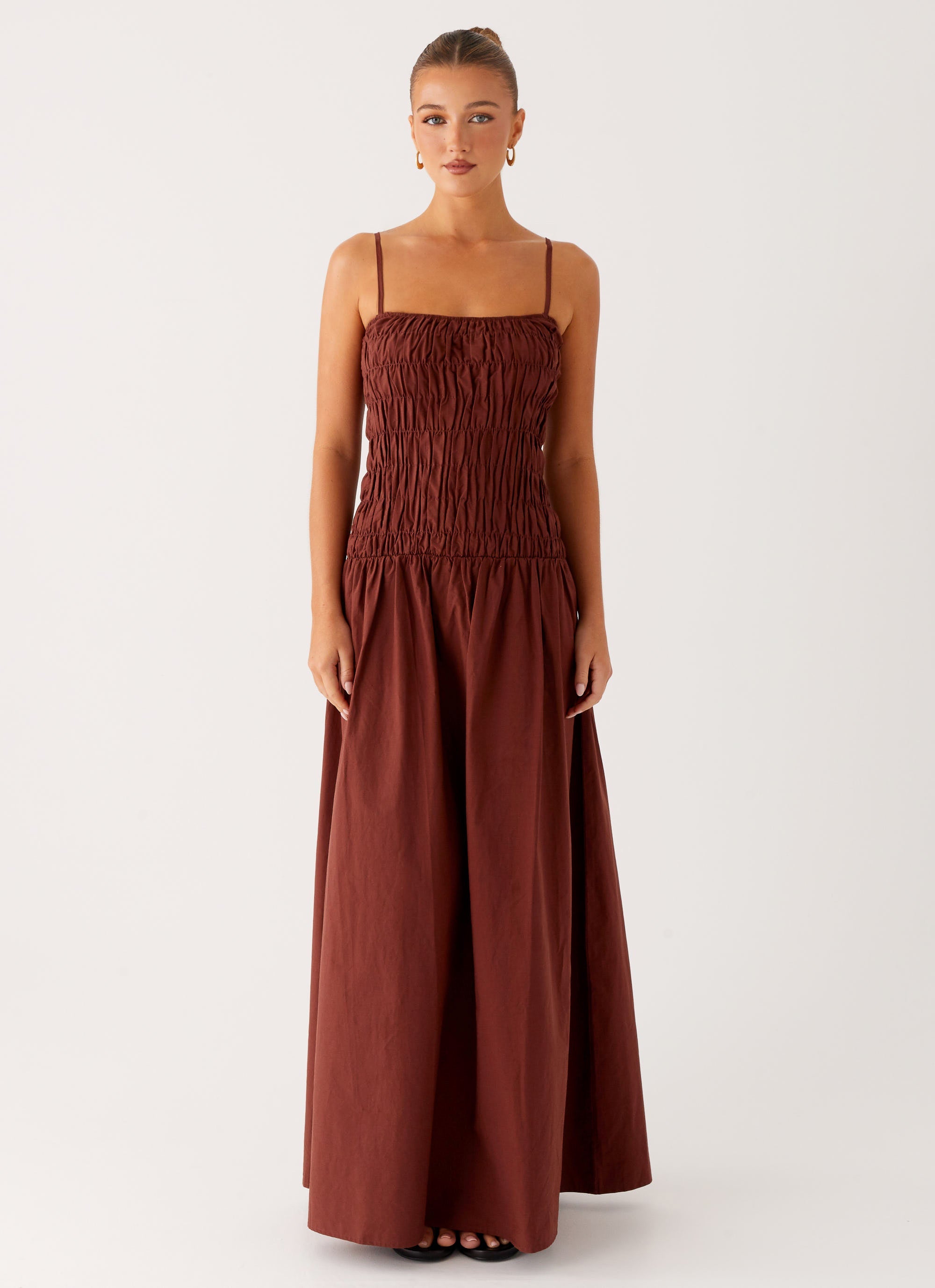 The Brooke Maxi Dress is an effortlessly romantic piece with a shirred bodice, adjustable straps, and a dropped waist. Its soft scoop neckline and flowing maxi length make it a timeless warm-weather staple.